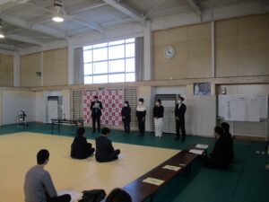 2月17日(火)全校朝会にて、1月に行われた地域間交流セミナーに参加した生徒の研修報告を行いました。沖縄の文化や歴史に触れ学んだこと、現地の中学生と交流してきたことを発表しました。一人ひとり、体験に基づく深い感想でした。