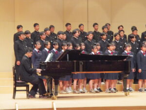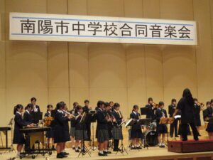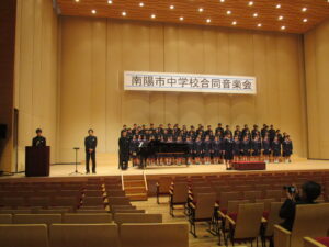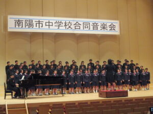 南陽市合同音楽会 Posted on 2025年10月17日 by akatyu 10月17日(金)第53回南陽市中学校合同音楽会がシェルターなんようホールで行われました。本校3年生と吹奏楽部が大ホールのステージに立ち、見事な合唱と演奏を披露しました。