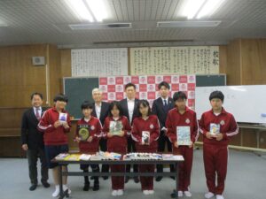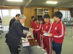 今年度、公益財団法人「日本教育公務員弘済会山形支部」様より、図書30冊を寄贈していただくこととなり、その贈呈式が10月21日(火)に行われました。弘済会の代表としてご来校いただいた和田精二様より「読書は心の栄養、たくさん読んで下さい」とのお言葉を頂戴しました。いただいた図書は特別支援学級で活用させていただきます。誠にありがとうございました。