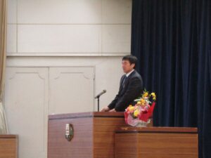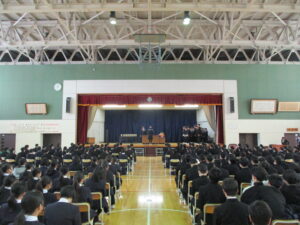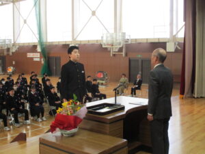 3月15日(日)学事奨励会会長賞贈呈式を行い、今年度、スポーツ・文化面で活躍した生徒を深瀬耕介学事奨励会会長様より表彰してもらいました。今年度24名の生徒が該当し、その頑張りを称えていただくとともに、これからに向けて激励をしていただきました。