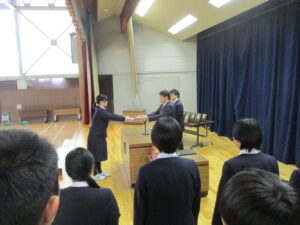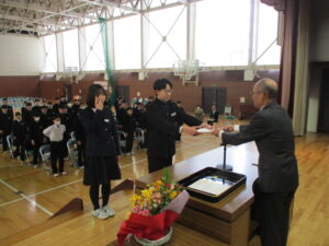 3月11日(水)の全校朝会で、生徒会学芸委員長からチャレンジテスト合格者への表彰が行われました。チャレンジテストは3学期期末テスト前に、基礎固めとして数学と英語で実施されたものです。また、生徒会長から新事務局員(5名)への委嘱状交付が行われました。生徒会事務局員として責任を持って活動していく決意が表れていました。