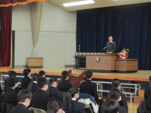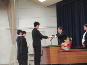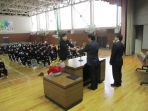 3月15日(日)学事奨励会会長賞贈呈式を行い、今年度、スポーツ・文化面で活躍した生徒を深瀬耕介学事奨励会会長様より表彰してもらいました。今年度24名の生徒が該当し、その頑張りを称えていただくとともに、これからに向けて激励をしていただきました。